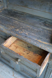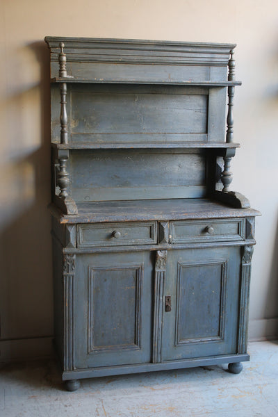 Original vintage, two-part continental dresser, with shelved top, lower cupboard and two drawers. Two shelves on the top interior, one wooden shelf in the lower interior. All original paint and beautifully aged patina - we have waxed to finish.
