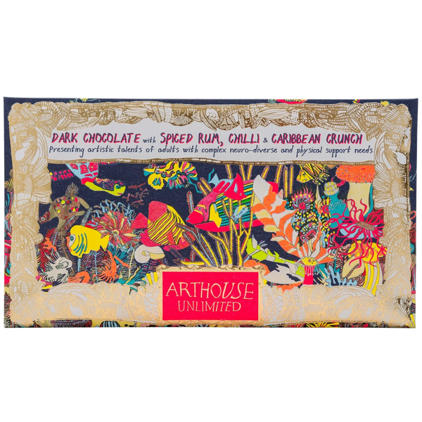 The Angels of the Deep artwork is a delicate collaborative artwork born from individual artists’ drawings which explored life on the coral reef. Each artist’s style and unique outlook is brought together in a carefully mastered composition. This beautiful design is a fitting way to celebrate the delicious dark chocolate, spiced rum, chilli and Caribbean crunch.
