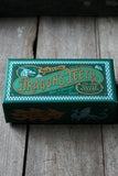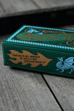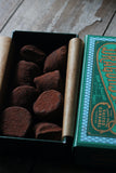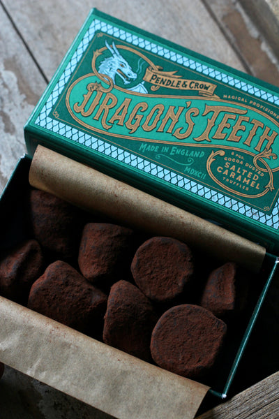 Lift off the lid of this truly beautiful emerald green, hand illustrated box. Peel back the layers of brown paper and inside you will find, eight dragons teeth! (Or…extremely luxurious cocoa-dusted salted caramel truffles)