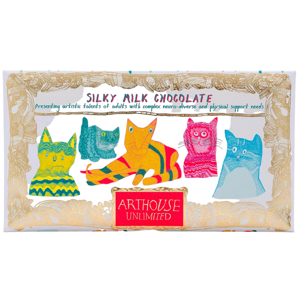 For cat lovers everywhere! The Miaow For Now artwork was created by a collaboration of several artists’ original drawings in the studio featuring some fantastic felines friends. The chocolate encased within is a mouthwatering smooth and silky milk chocolate.