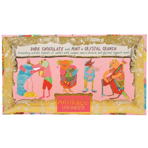 Each bar is lovingly wrapped in coloured foiled, and placed inside a fully recyclable paper envelope, that features the fantastic artwork of the ARTHOUSE Unlimited artists.