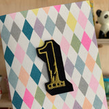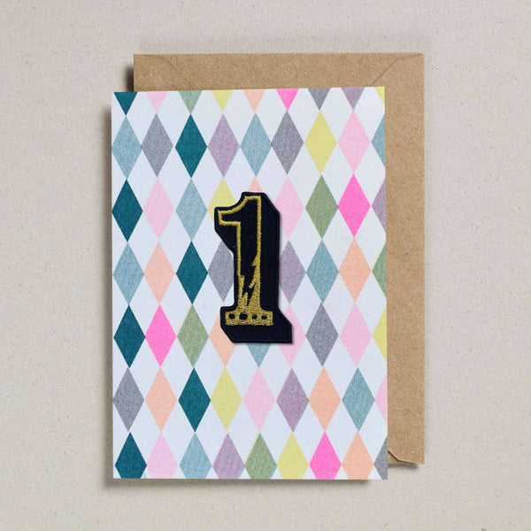 Risograph printed card embellished with an embroidered iron on fabric '1' patch that can be removed and ironed onto clothing.