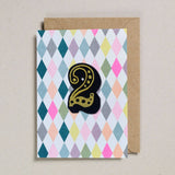 Risograph printed card embellished with an embroidered iron on fabric '2' patch that can be removed and ironed onto clothing.