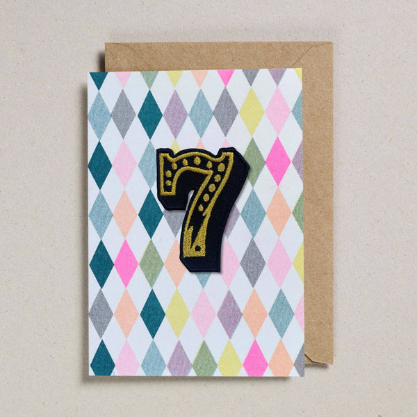 Risograph printed card embellished with an embroidered iron on fabric '7' patch that can be removed and ironed onto clothing.