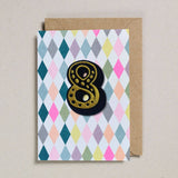 Risograph printed card embellished with an embroidered iron on fabric '8' patch that can be removed and ironed onto clothing. Blank inside for your own message.