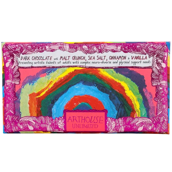 A tantalisingly smooth dark chocolate, malt crunch, sea salt, cinnamon and vanilla. Made in the UK with responsibly sourced cocoa this bar features Magical Mysteries, a stunning artwork created by artist Arthur Lyle and presented in a dazzling purple frame. Wrapped in coloured foil & encased in a recyclable envelope. An ideal gift for chocoholics, art lovers & good-cause supporters everywhere!