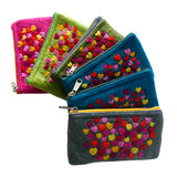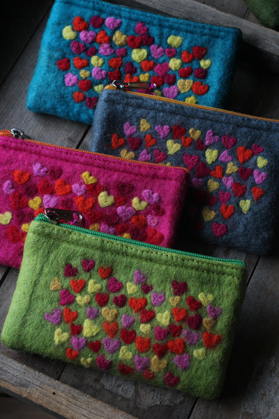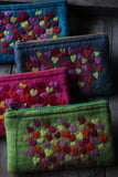 Small zip up purses with little hearts dotted on a vibrant coloured background, each heart is dry felted with a needle.