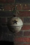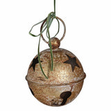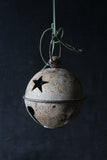 Distressed, rustic gold metal bauble, with green velvet ribbon.