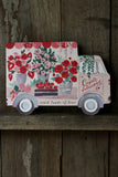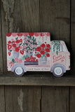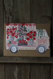 Cut into the unique shape of a flower delivery truck this illustrated Valentines greeting card is carrying strawberries and roses to a loved one. Perfect as a Valentine's day card or a special anniversary card for someone who deserves a beautiful bouquet.